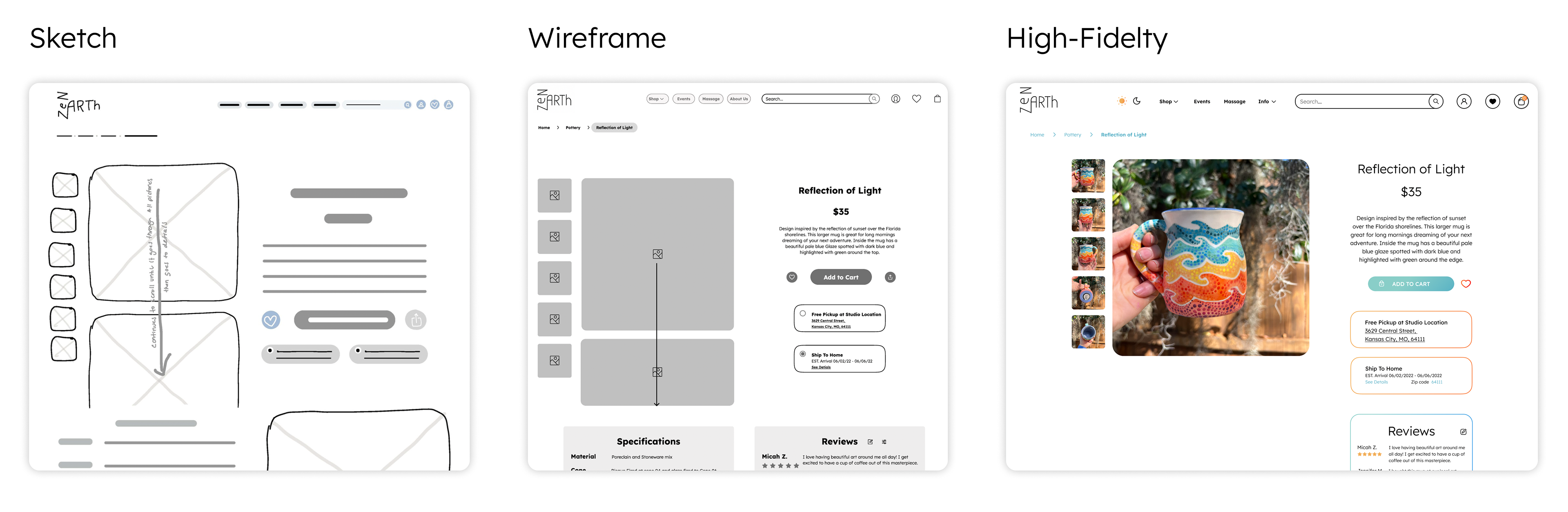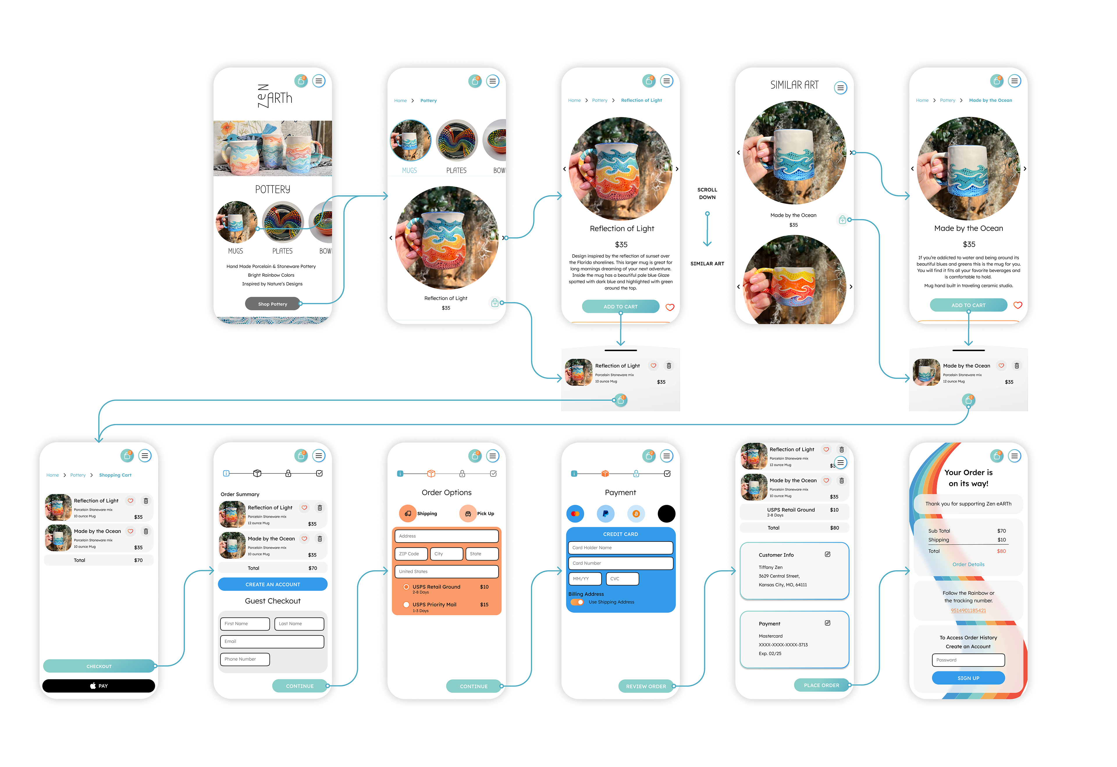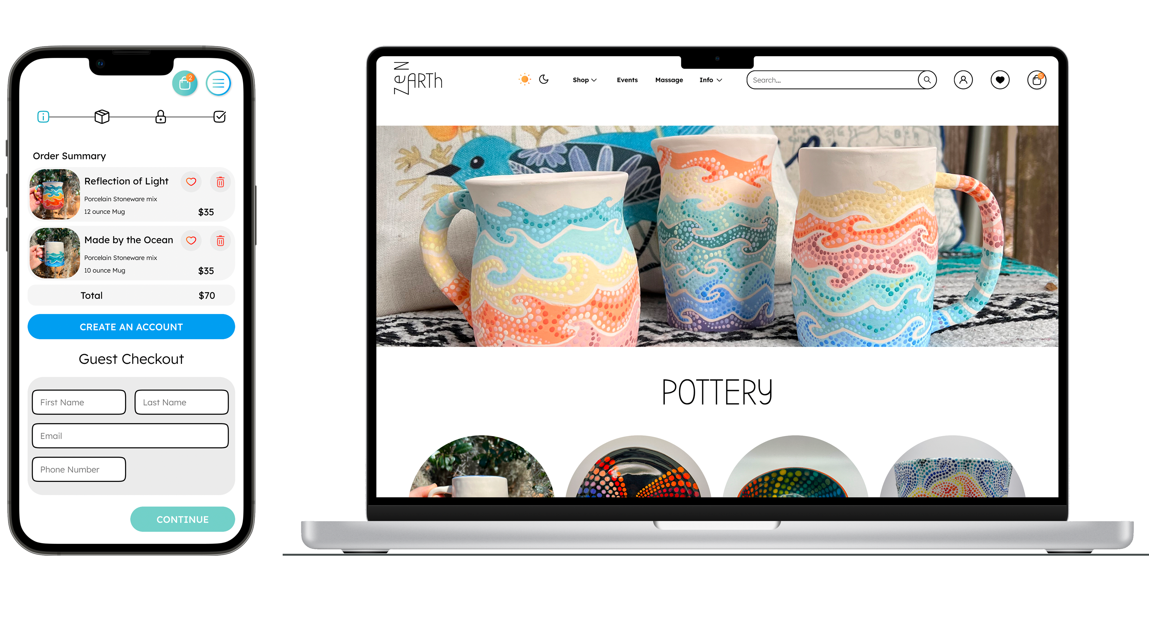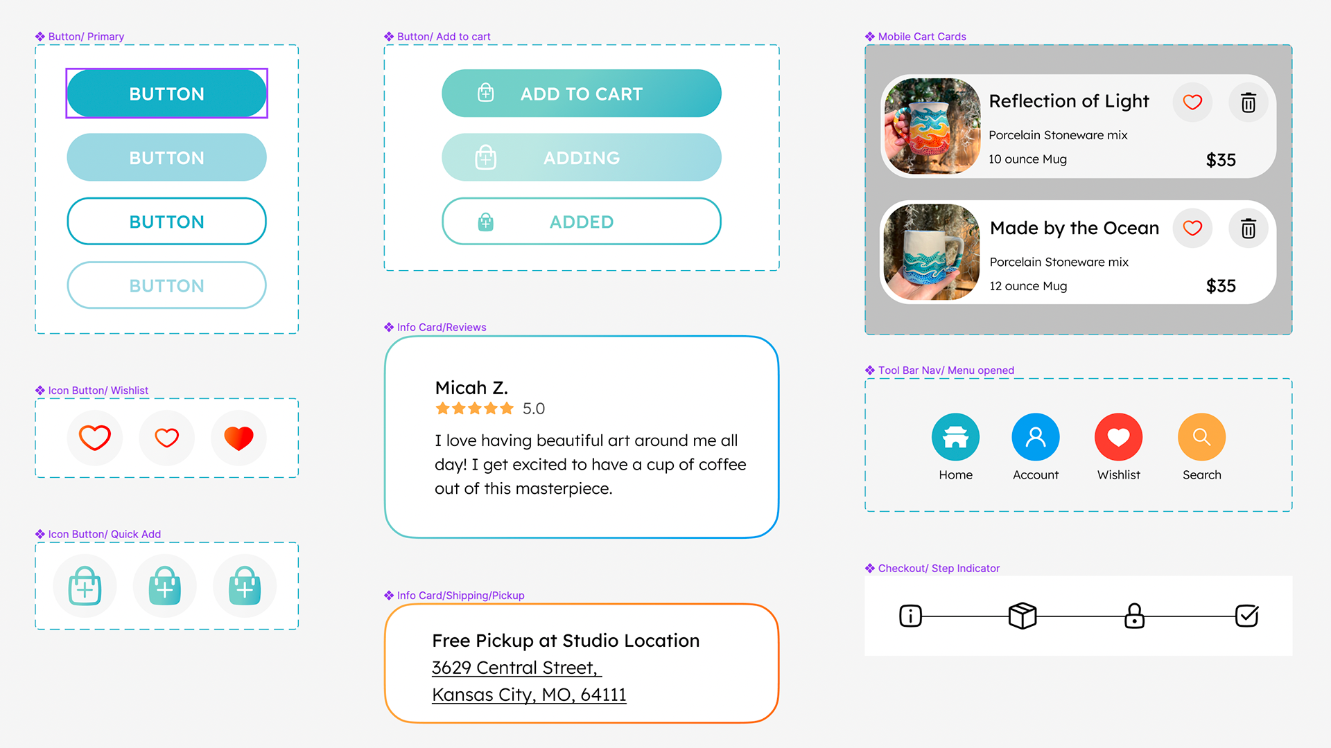 I based the color scheme for the website on my pottery designs. Through color psychology, I adapted each color to different actions within the website. This helps inform and encourage the user to make a sale or discover more art.
