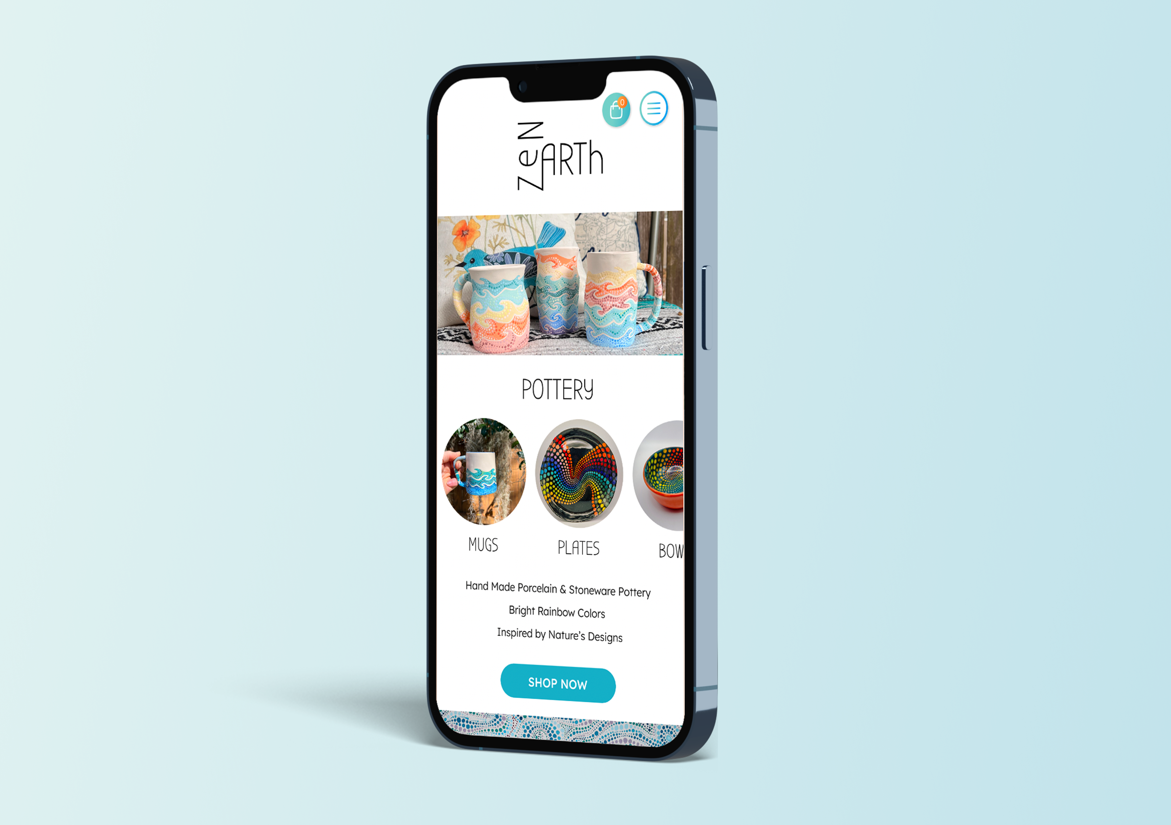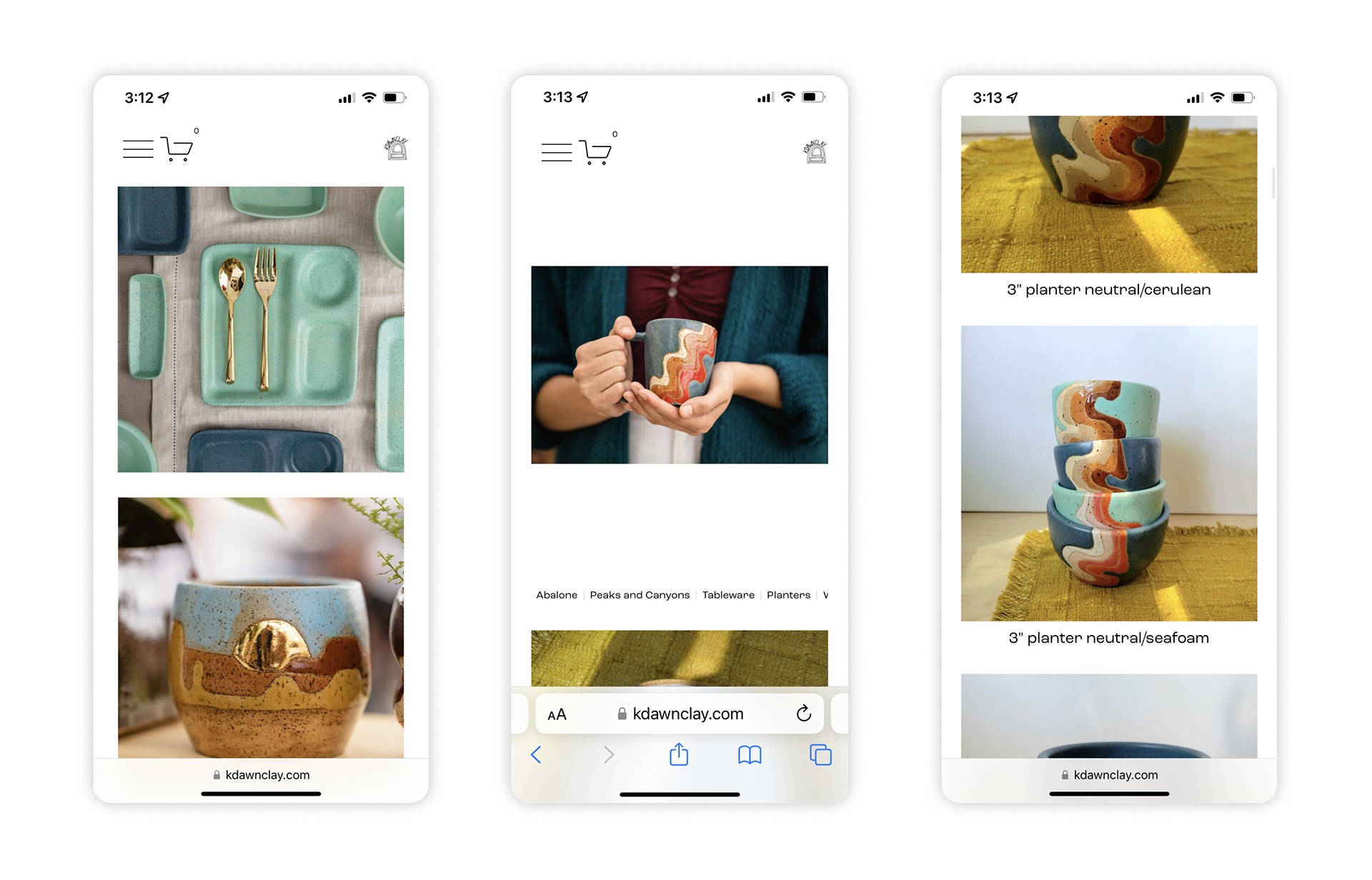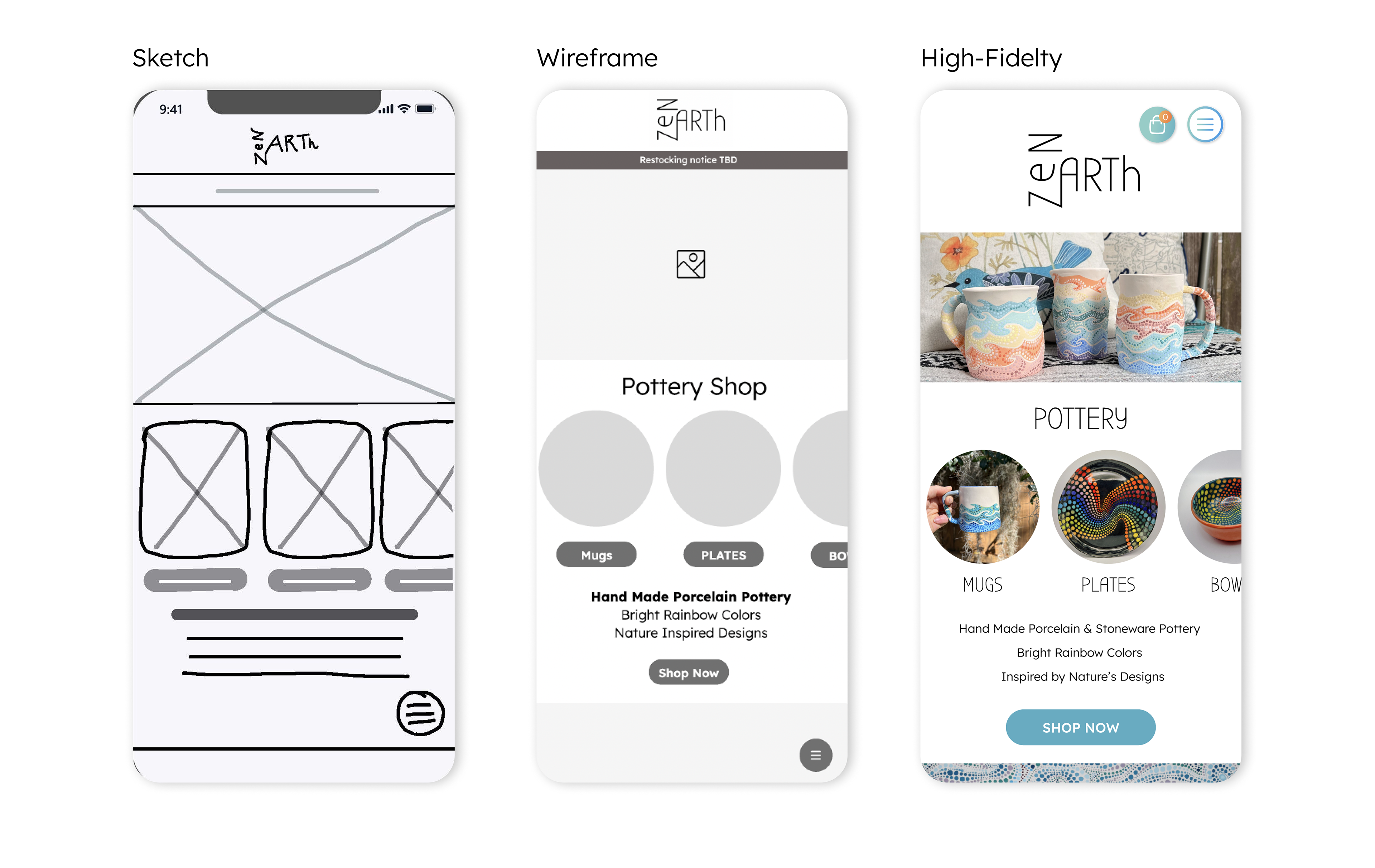 I based the color scheme for the website on my pottery designs. Through color psychology, I adapted each color to different actions within the website. This helps inform and encourage the user to make a sale or discover more art.