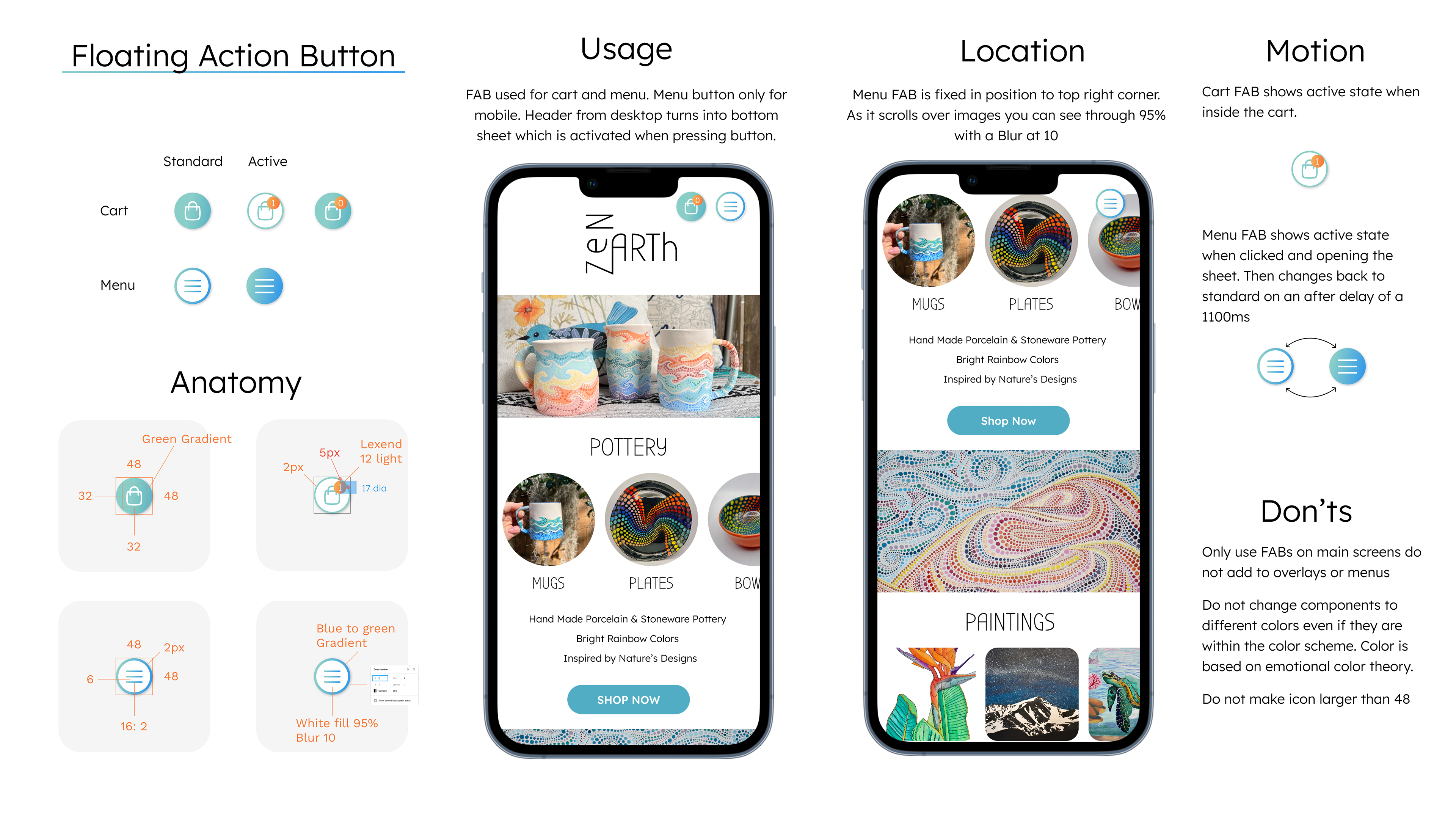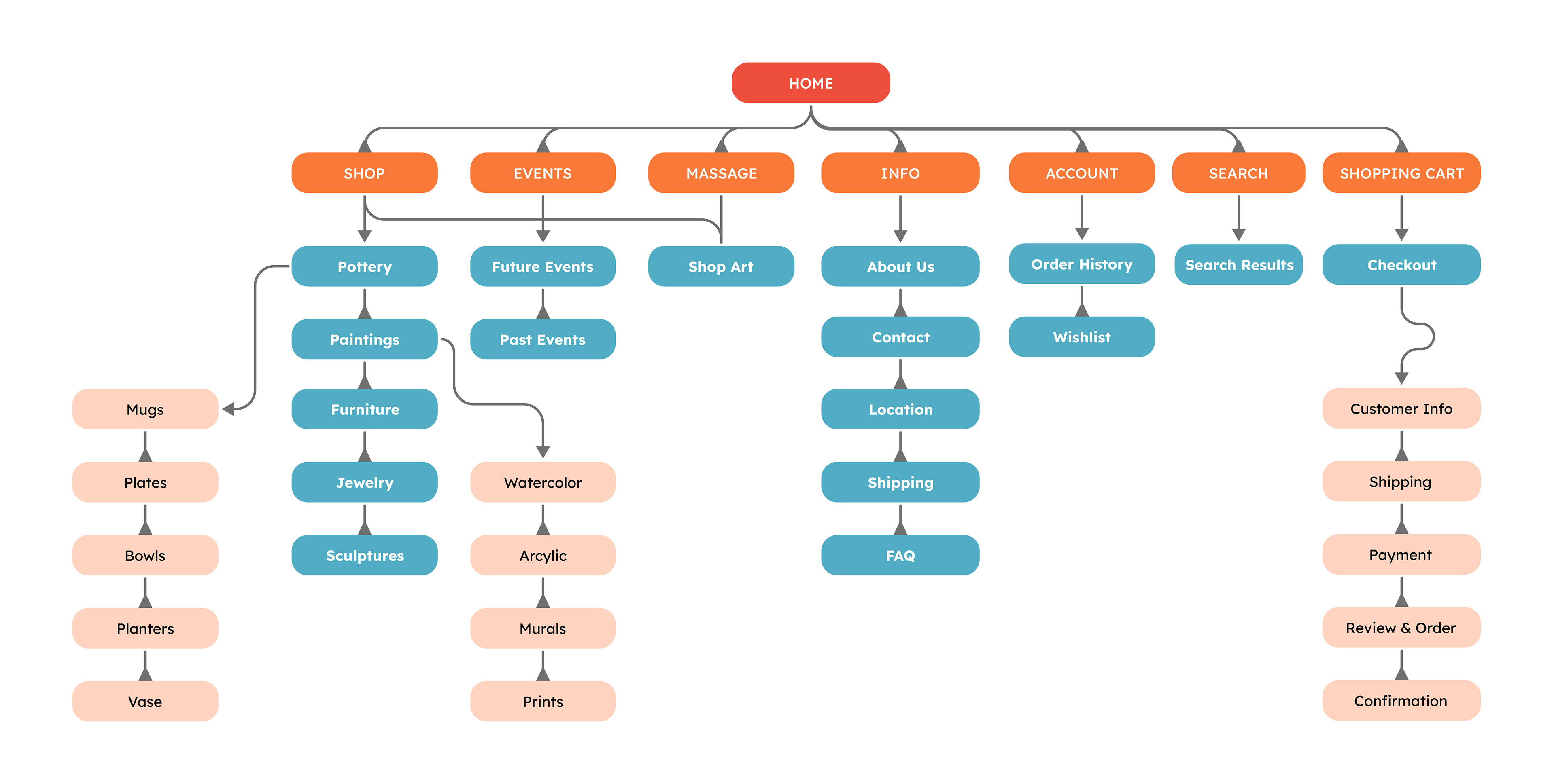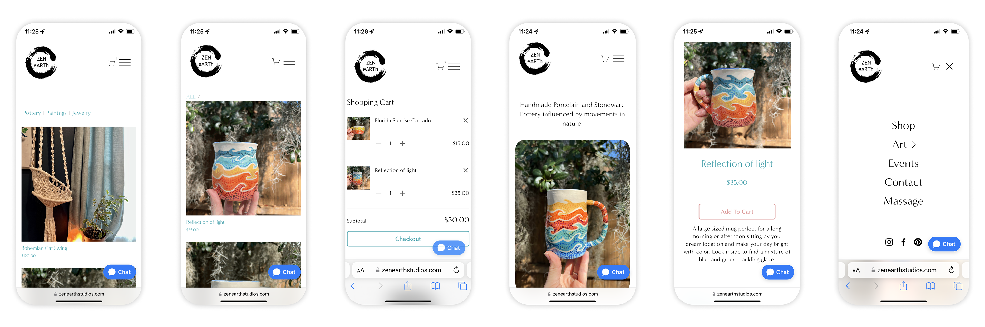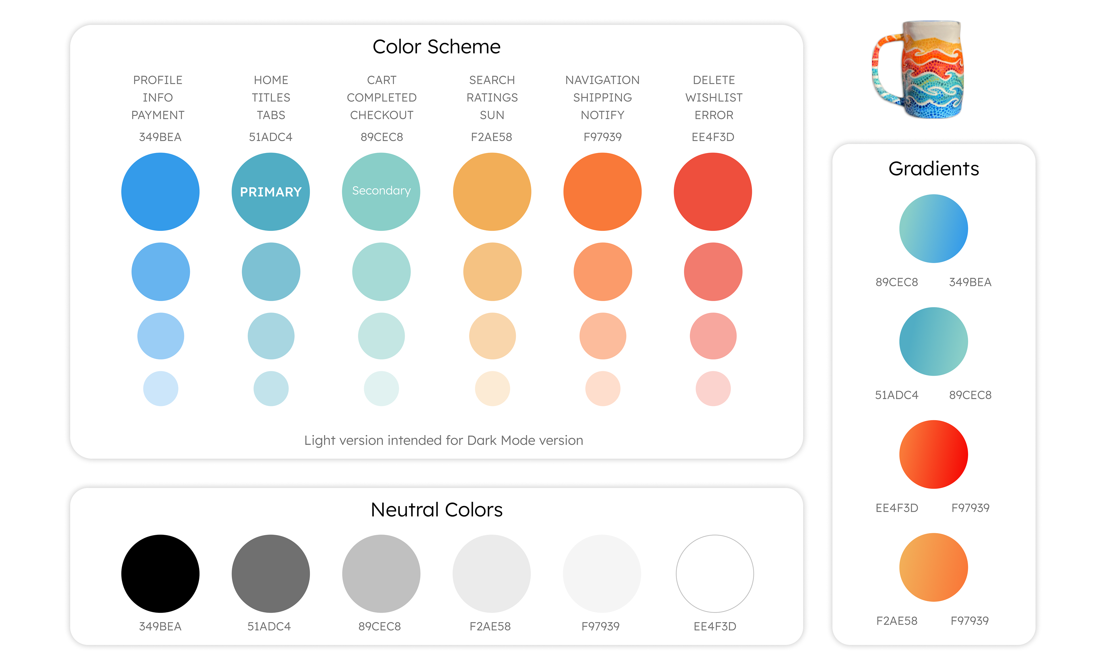 I based the color scheme for the website on my pottery designs. Through color psychology, I adapted each color to different actions within the website. This helps inform and encourage the user to make a sale or discover more art.