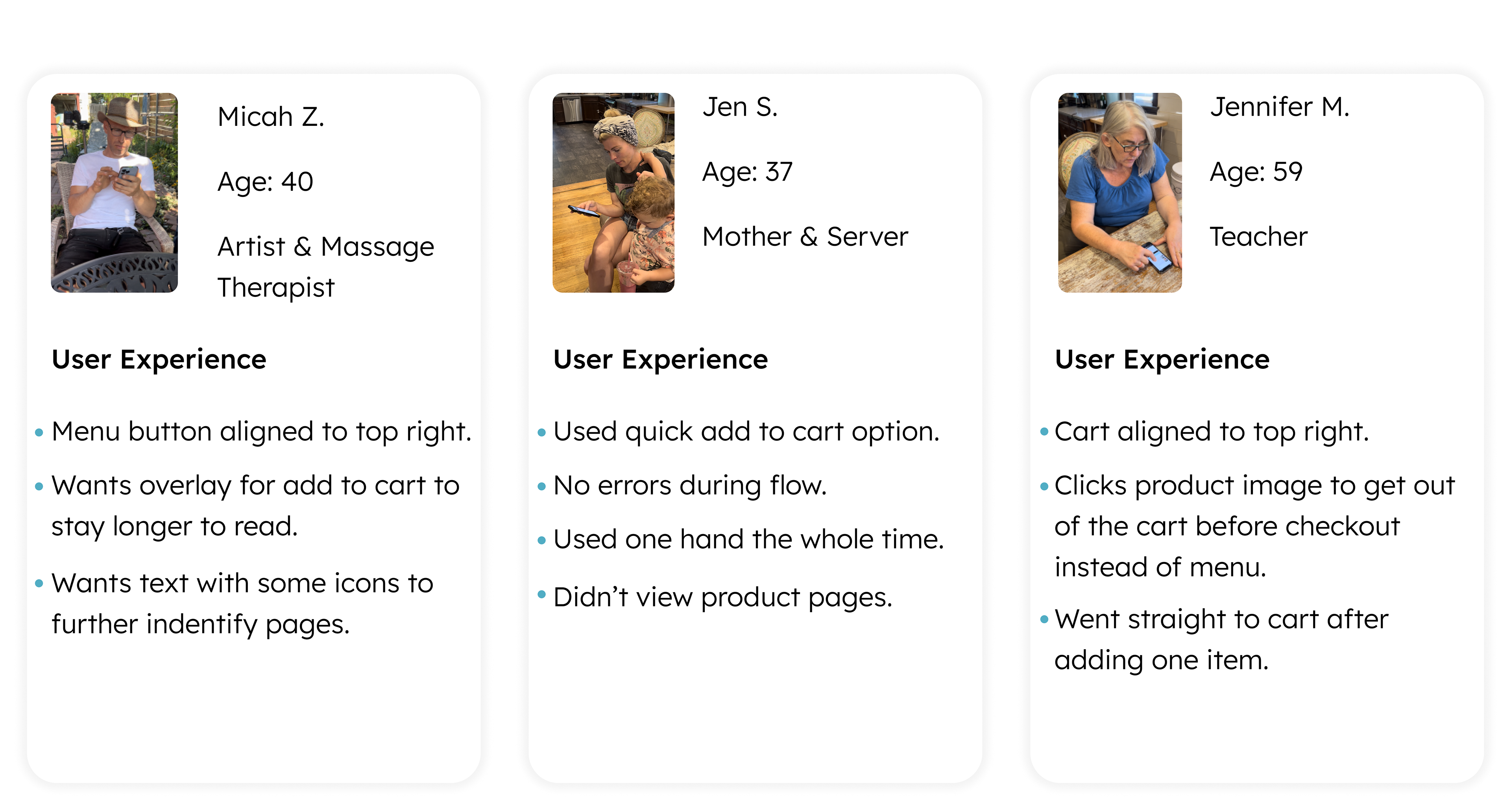 During the user testing phase, I tested the mobile prototype with different age groups, lifestyles, and genders. In doing this, I got different feedback for similar elements within the websites and how the user would like to see the website perform.